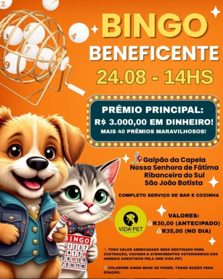 A ONG Vida Pet, com atuação em São João Batista, promove neste domingo, dia 24 de agosto, um bingo beneficente em prol dos animais. A ação tem como objetivo arrecadar recursos para castrações, vacinas e atendimentos veterinários de animais resgatados e em situação de vulnerabilidade.