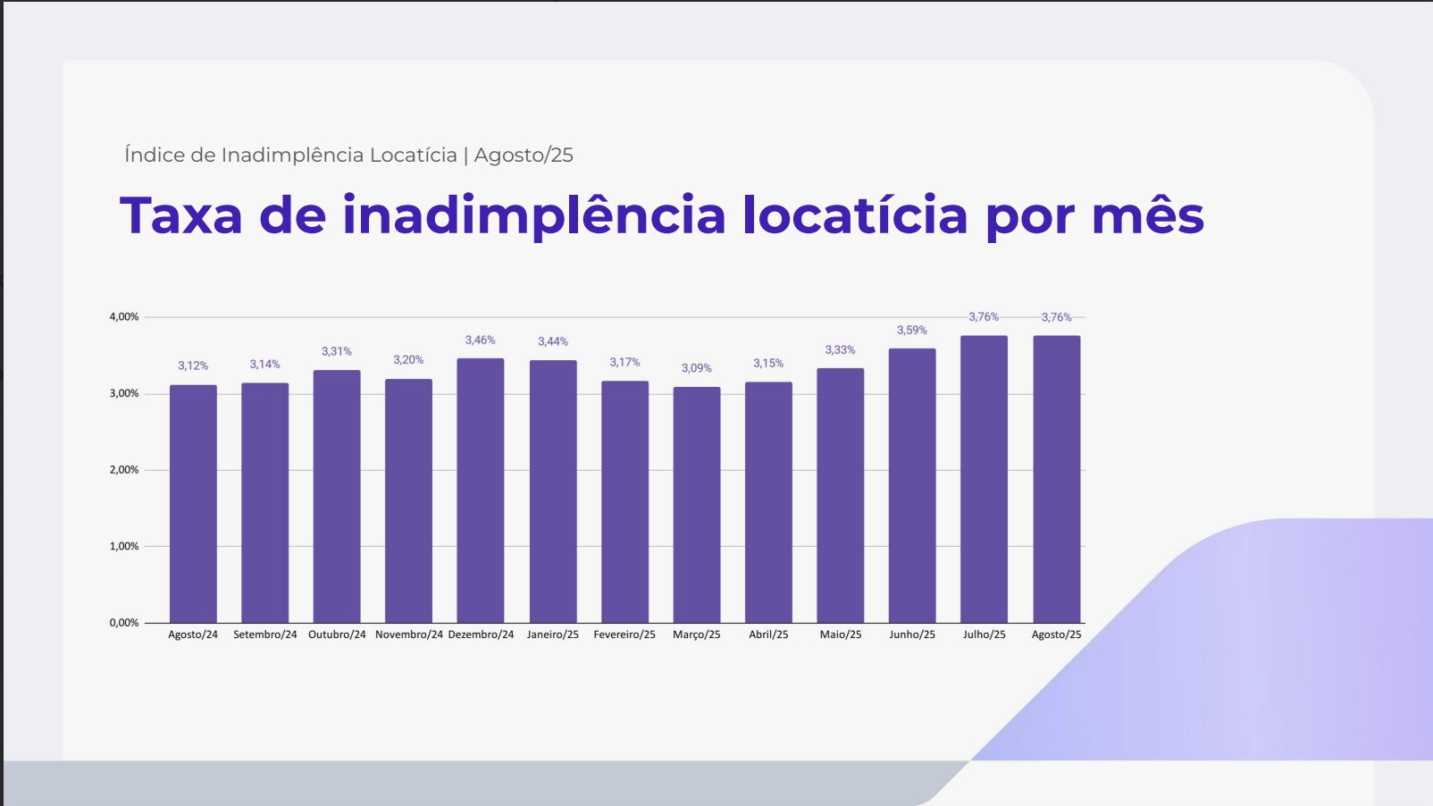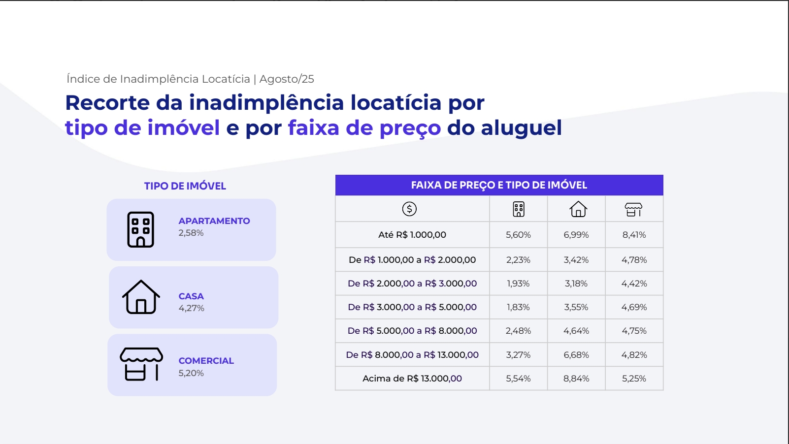“O índice mostra que a inadimplência é maior nas faixas extremas de aluguel, tanto nos imóveis de alto padrão quanto nos de menor valor, refletindo diferentes desafios financeiros. Já nas faixas intermediárias, os dados seguem mais estáveis, o que indica um equilíbrio maior entre a renda dos locatários e o valor dos aluguéis, tanto no mercado residencial quanto comercial”, avalia Gonçalves.